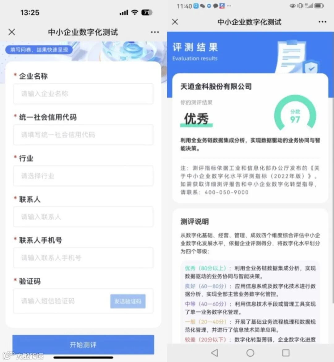 “企业数字化水平测试工具”是天道金科团队依托于国家工信部发布的《中小企业数字化水平评测指标(2022年版)》打造的企业轻量化数字能力评分产品,该工具根据行业特点,分为制造业数字化水平评测表、生产性服务业数字化水平评测表和其他行业数字化水平评测表,企业仅需根据实际情况勾选对应选项即可获取自身数字化水平等级评价,系统将给予企业充分的分析结论,帮助企业和政府部门快速测评摸清家底,有针对性的推动实施数字化转型。目前该产品支持全国企业免费线上使用,3分钟即可快速出结果。此外,平台还提供数字化转型咨询服务,通过拨打服务热线可以获取转型方向与方法上的1对1专业指导。欢迎扫描下方二维码进行企业自测。