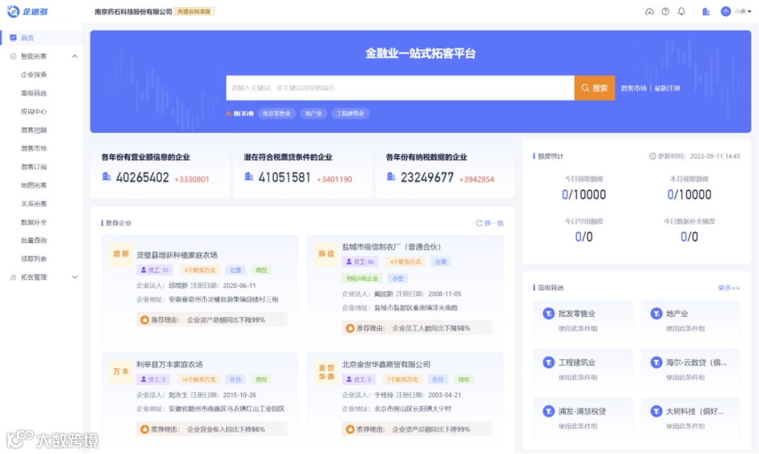 "企道多"是天道金科团队基于自有全量数据要素底座,创新打造的服务于金融主体与企业主体的一套智慧化、可配置化、精准化的统一智能营销运营系统。该产品以超3亿家市场主体的360°全面企业画像数据库、10000个数据维度及高达95%的企业覆盖率,为用户提供智能营销全生命周期数字解决方案,帮助各市场主体解决线上营销及运营难题。目前产品开发了“企业探查”“高级筛选”“潜客挖掘”“潜客市场”“地图获客”“关系获客”六大特色功能,直击市场主体在获客、精准营销、客群运营等方面遇到的难题痛点,助力用户轻松实现高效获客,达到业务增长和可持续盈利的最终目标。