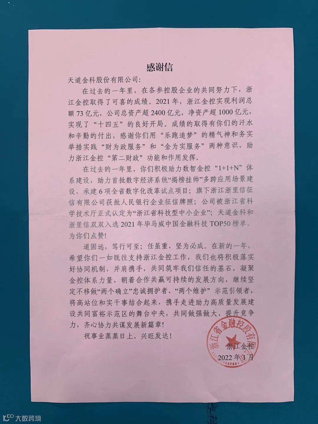 同时,天道金科收到了浙江金控发来的感谢信,并在日前浙江金控召开的2022年工作会上荣获“2021年度数智金控创新奖”。2022年,天道金科将再接再厉,在金控“大协同”工程、“数智金控”体系建设、浙江省高质量发展建设共同富裕示范区、奋力打造“重要窗口”等战略工作中发挥更大的贡献。