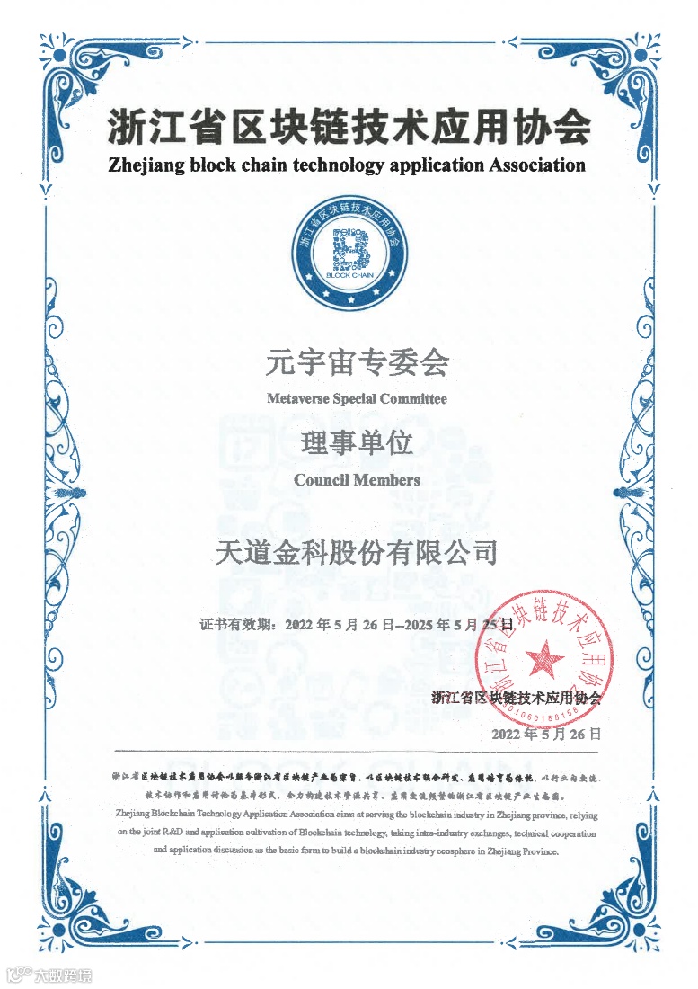 喜讯|天道金科当选浙江省区块链技术应用协会元宇宙专委会首批理事单位