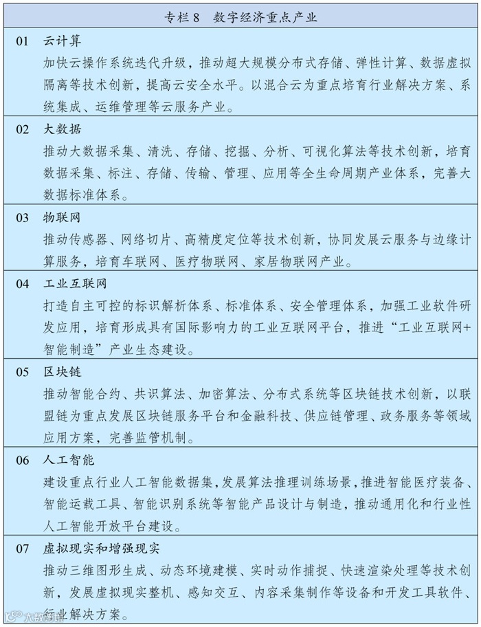 在该篇章中共有两个专栏图表,分别框定了数字经济重点产业和数字化应用场景的具体范围。其中,数字经济重点产业包括云计算、大数据、物联网、工业互联网、区块链、人工智能、虚拟现实和增强现实产业。数字化应用场景则以智能交通为首列,包括能源、制造、农业水利、教育、医疗等10个场景,这些规划为数字经济发展指明了方向、绘就了蓝图。