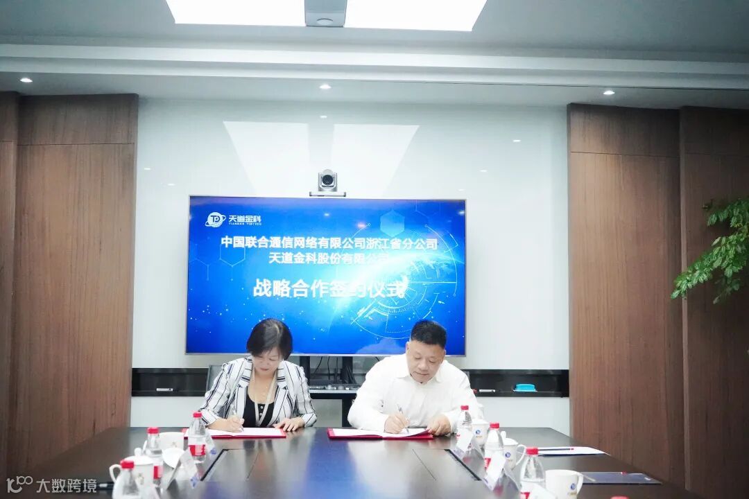 10月15日,天道金科股份有限公司总裁任军霞女士与中国联合网络通信有限公司浙江分公司副总经理虞允纲于天道金科杭州总部签署了战略合作协议,标志着天道金科与浙江联通正式进入全面战略合作阶段。未来,双方将建立长期稳定的深度合作关系,发挥各自优势,强强联合,互惠共赢,创新“数字+金融”新合作。