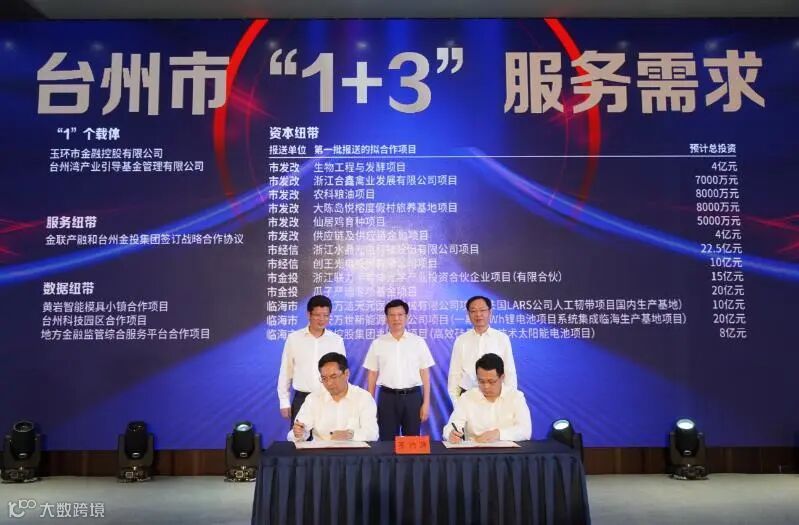 市委常委、常务副市长蔡永波与浙江金控总经理杨强民代表台州市政府与浙江省金融控股有限公司签订“上门送‘1+3’服务”活动合作协议。