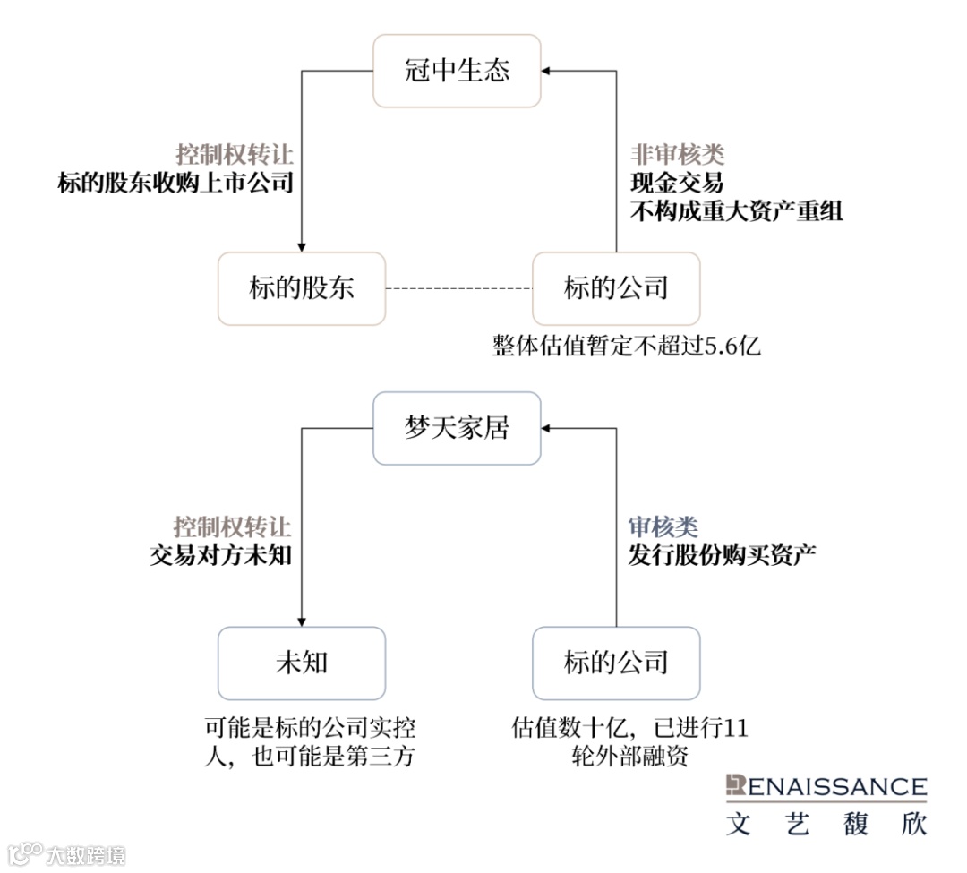 冠中生态和梦天家居两起交易都属于“控制权转让+资产收购”同步公告的交易模式,走向迥异。冠中生态是明确向新的实控人收购资产,收购资产的规模没有构成重大资产重组,支付方式为现金,收购资产属于非审核类事项。而梦天家居的收购资产形式为发行股份购买资产,属于审核类事项,需要交易所审核中心审核、证监会注册,至于发行股份购买资产的对象与新实控人是属于同一方还是第三方因最终未能公告不得而知。