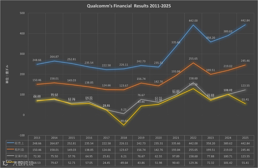 高通目前的业绩并不算差。下图绘制了该公司2013年至2025年的销售额、营业利润和净利润(公司财年于9月底结束)。从毛利率来看,2013年毛利率超过60%,近年来略有下降,但仍维持在55%左右。