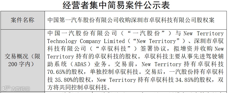 根据国家市场监管总局发布的公告,一汽股份已经与New Territory Technology Company Limited(简称“New Territory”)、卓驭科技签署协议,拟增资并收购 New Territory持有的部分卓驭科技股权。