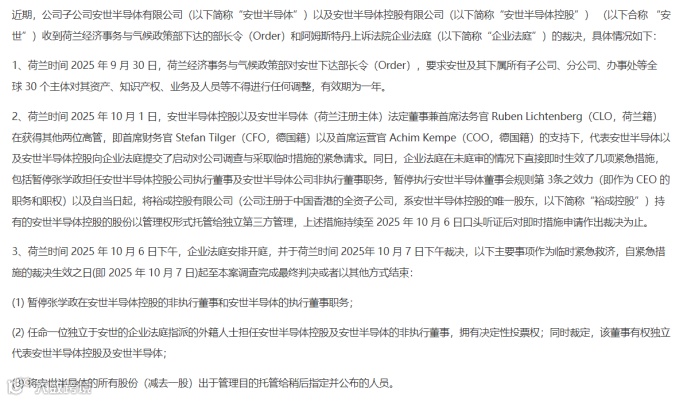 10月12日,闻泰科技发布公告称,荷兰时间9月30 日,荷兰经济事务与气候政策部对安世下达部长令,要求安世及其下属所有子公司、分公司、办事处等全球 30 个主体对其资产、知识产权、业务及人员等不得进行任何调整,有效期为一年。与此同时,安世半导体的首席法务官、首席财务官等外籍高管向法院提交了启动对公司调查与采取临时措施的紧急请求。荷兰企业法庭已经暂停了闻泰科技委派的安世半导体CEO履行相关职务。