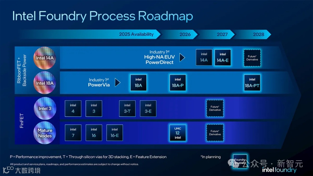 在其Foundry制程路线图中,Intel将节点划分为四条技术路径:位于上层的18A与14A节点代表最前沿技术,下方则是Intel 3与一些成熟节点。