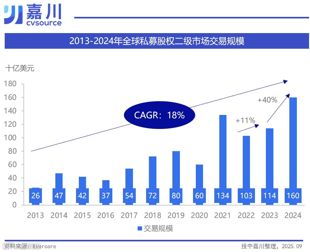 而且海外市场S交易“募投双旺”,据Evercore披露的数据,全球的S交易从2013年的260亿美元,已经发展到2024年的1600亿美元。即使中间有部分年份下降,10年CAGR(年均复合增长率)仍高达18%。尤其是最近两年增长强劲,2024年交易规模相比于2023年同比增长40%(见下图)。
