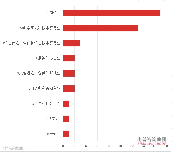 其中,C制造业有17家;M科学研究和技术服务业有13家;I信息传输、软件和信息技术服务业有3家;F批发和零售业、G交通运输、仓储和邮政业以及L租赁和商务服务业各有2家;B采矿业、Q卫生和社会工作以及E建筑业则各占1家。