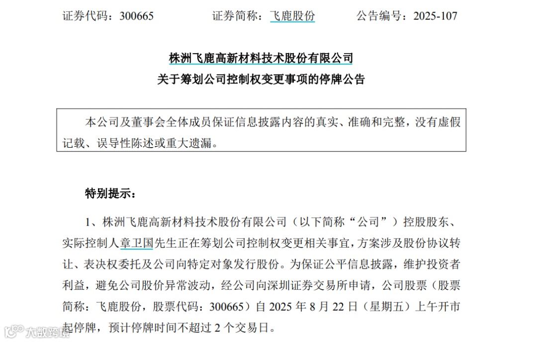8月21日,飞鹿股份发布公告称,公司控股股东、实际控制人章卫国正在筹划公司控制权变更相关事宜。经申请,飞鹿股份股票自8月22日(星期五)开市起停牌。