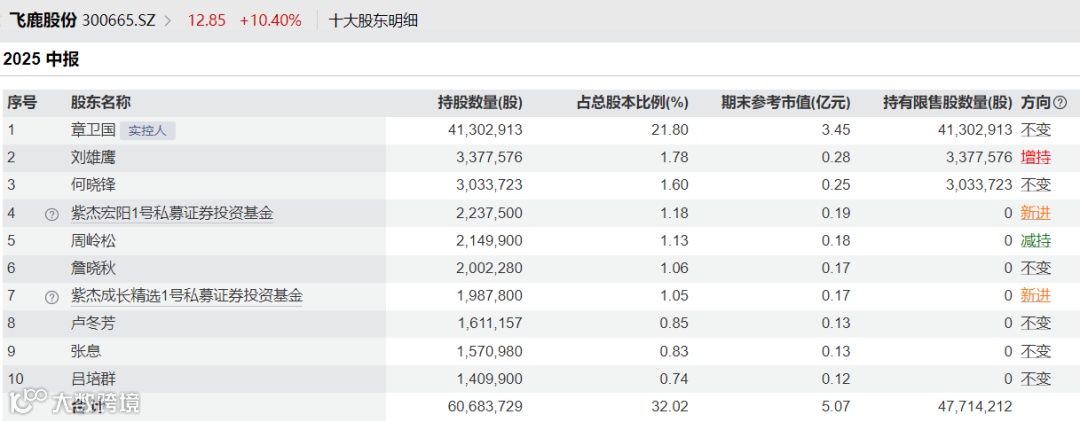 截至二季度末,章卫国为飞鹿股份第一大股东,持股数量为4130.29万股,占总股本比例为21.8%。
