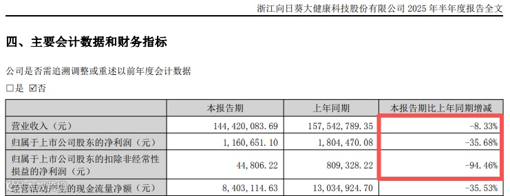 2025年上半年,向日葵的营业收入同比下降8.33%至1.44亿元,归母净利润同比下降35.68%至116.07万元,扣非后净利润同比下降94.46%至4.48万元。