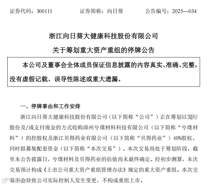 向日葵公告称,兮璞材料及贝得药业的估值尚未最终确定,但经初步测算本次交易预计构成《上市公司重大资产重组管理办法》规定的重大资产重组。