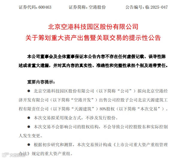 空港股份(600463)6月18日晚间公告称,公司拟以现金方式向控股股东空港开发出售公司控股子公司天源建筑80%股权。经初步测算,此次交易预计构成重大资产重组,公司股票不停牌。