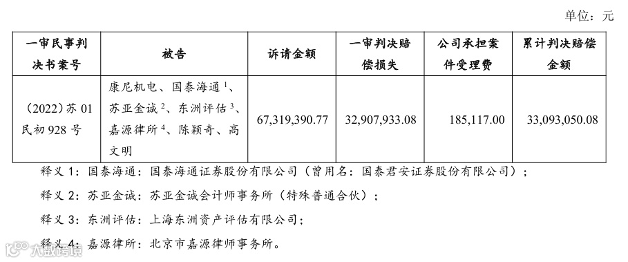 截至本公告日,共有17名投资者对公司提起了索赔诉讼,累计诉请金额为382,632,943.56元,均已下达一审判决,一审判决康尼机电负担的赔偿损失和案件受理费合计金额为83,146,513.09元,其中,一审民事判决书【(2022)苏01民初3953号】中,判决国泰海通对康尼机电负担的赔偿损失和案件受理费合计金额为547,746.32元,在50%范围内承担连带责任;一审民事判决书【(2022)苏01民初928号】中,对于康尼机电负担的赔偿损失和案件受理费合计金额为33,093,050.08元,判决国泰海通、苏亚金诚、东洲评估、嘉源律所、陈颖奇、高文明分别在50%、40%、15%、2%、2%、2%范围内承担连带责任。