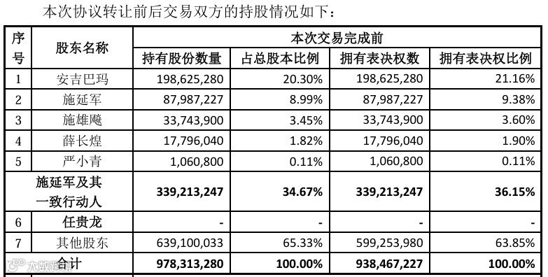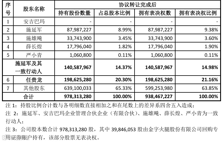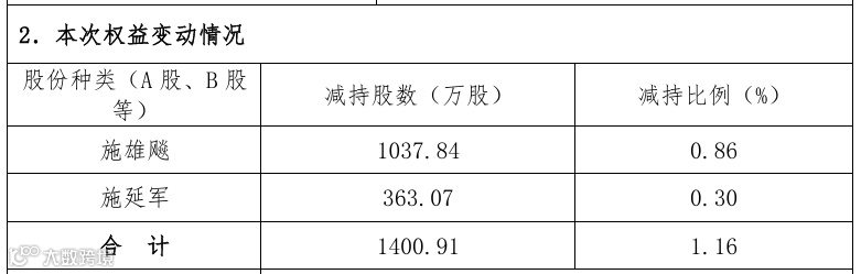本次权益变动后,股东施延军先生及其一致行动人施雄飚先生、薛长煌先生、严小青女士合计持有公司股份60,530,627股,占公司总股本的4.999993%,不再是公司持股5%以上的股东。
