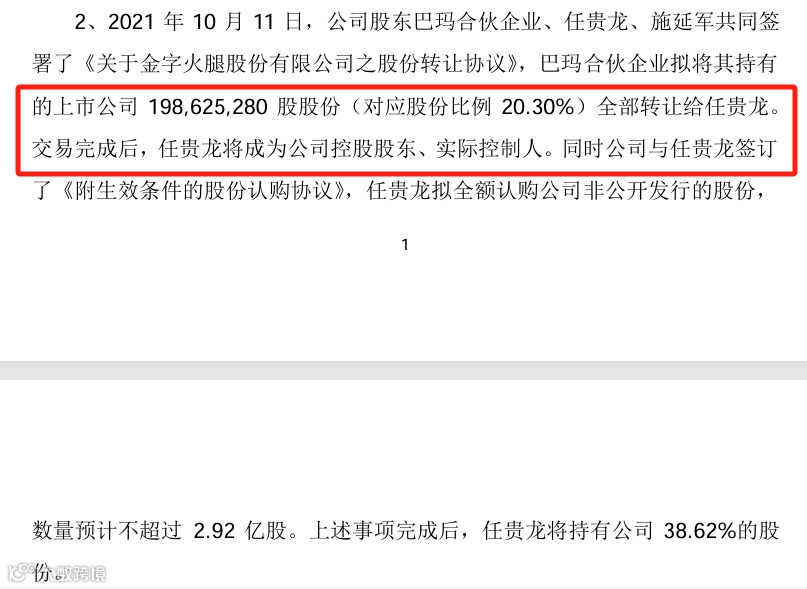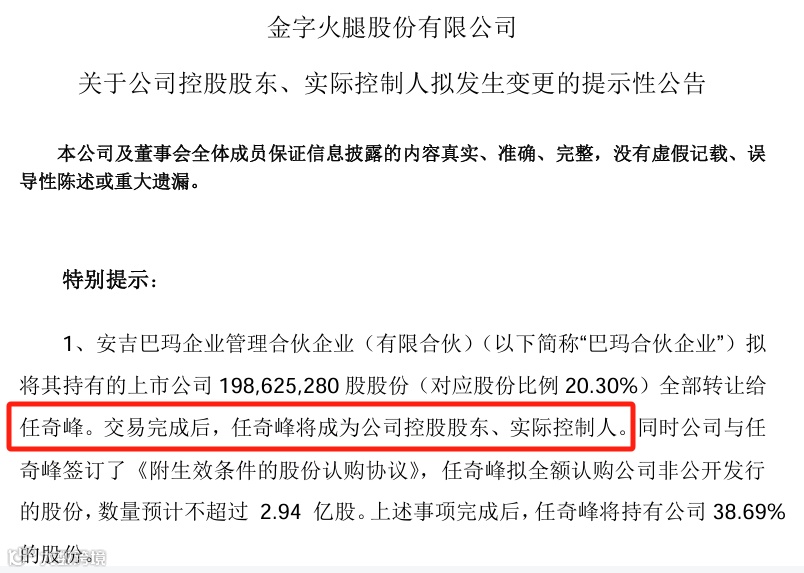 值得注意的是,在任贵龙与原控股股东签署股权转让协议前,原本的签署对象是任奇峰,但不久后,金字火腿公告与任奇峰签署的股权转让协议、股份认购协议解除,转由任贵龙签署,任奇峰则担任金字火腿董事长。