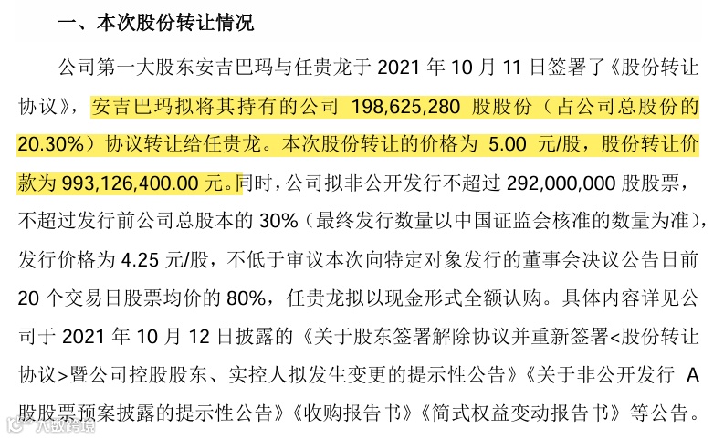 2021年10月,公司原第一大股东安吉巴玛与任贵龙签署了《股份转让协议》,安吉巴玛拟将其持有的公司198,625,280股股份(占公司总股份的20.30%)协议转让给任贵龙。本次股份转让的价格为5.00元/股,股份转让价款为993,126,400.00元。同时,公司拟非公开发行不超过292,000,000股股票,不超过发行前公司总股本的30%(最终发行数量以中国证监会核准的数量为准),发行价格为4.25元/股,不低于审议本次向特定对象发行的董事会决议公告日前20个交易日股票均价的80%,任贵龙拟以现金形式全额认购。