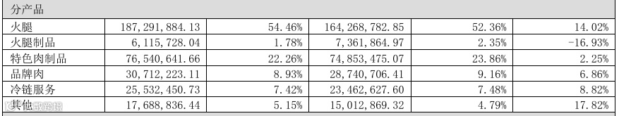 金字火腿的营业收入主要来自于火腿、特色肉制品等商品的销售。2024年度,金字火腿公司的营业收入为3.44亿元,其中火腿业务的营业收入为人民币1.87亿元,占营业收入的54.46%,特色肉制品业务的营业收入为人民币0.77亿元,占营业收入的22.26%。
