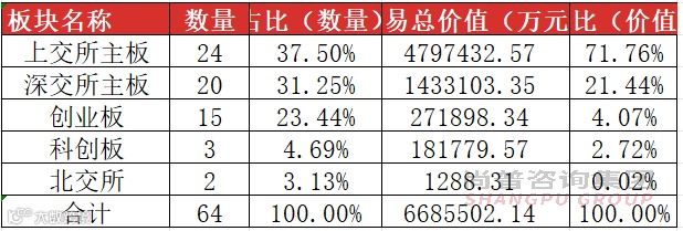 据统计,上月A股上市公司并购重组涉及交易金额共计约6,685,502.14万元,从上市板块来看,上交所主板交易金额约4,797,432.57万元、深交所主板交易金额约1,433,103.35万元,创业板约271,898.34万元,科创板181,779.57万元,北交所1,288.31万元。