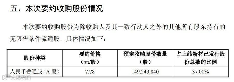 公告显示,此次要约价格为7.78元/股,要约收购上纬新材37%股份的总价款为11.61亿元。