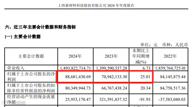 2024年,上纬新材的归母净利润为8868.14万元,同比增长25.01%;扣非后净利润为8034.99万元,同比增长20.34%。