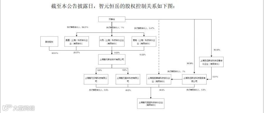 股权穿透可见,智元恒岳的有限合伙人分别是上海智元盈丰科技有限公司、上海恒岳鼎峰科技合伙企业(有限合伙),其中上海智元盈丰科技有限公司是智元新创的全资子公司。