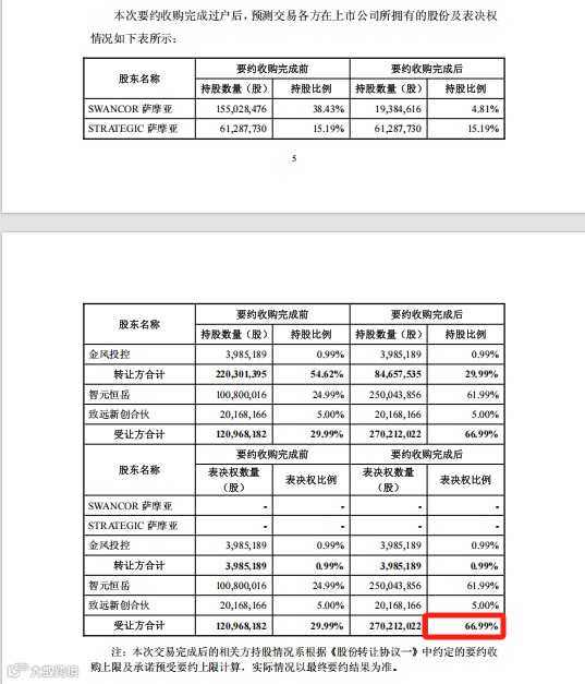 完成上述权益变动后,智元恒岳和致远新创将合计拥有上纬新材29.99%的股份及对应股份的表决权。上纬新材的控股股东将由SWANCOR萨摩亚变为智元恒岳,实控人将变为邓泰华。