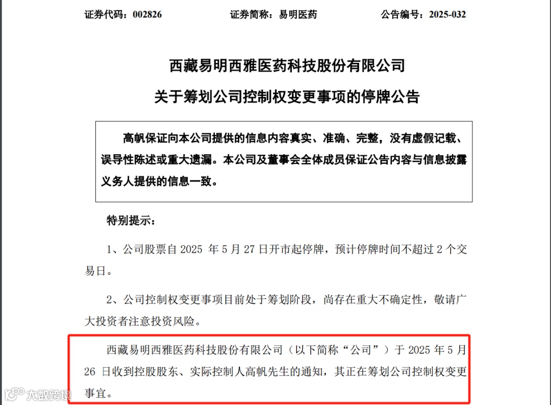 易明医药公告称,目前,公司控制权变更事项尚在筹划中,尚未签署正式协议,具有重大不确定性。