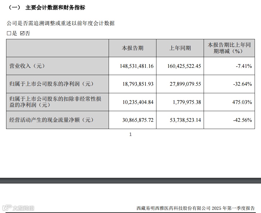 2025年第一季度,易明医药的营业收入为1.49亿元,同比下降7.41%;归母净利润为1879.39万元,同比下降32.64%。