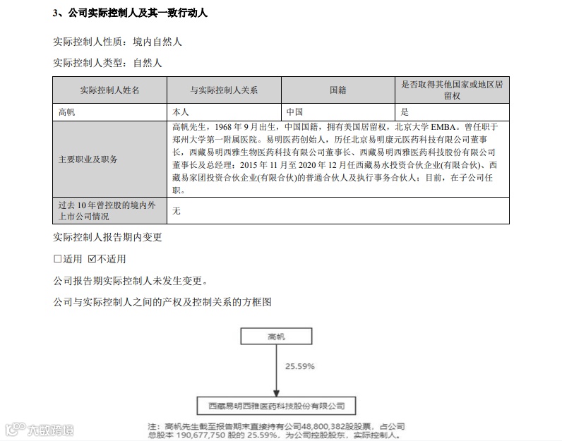 截至2025年第一季度末,高帆直接持有易明医药25.59%的股权。2024年年报显示,高帆是易明医药的控股股东、实际控制人,持股比例达25.59%。