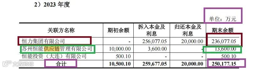 虽然此处的“恒力重工关联方”没有明确是哪家公司,但通过公告表述及重组草案的信息结合印证,这里的关联方应该是恒力集团有限公司(恒力集团)、苏州恒能供应链管理有限公司(恒能供应链)、恒能投资(大连)有限公司(下称“恒能投资”),三家公司2023年末向恒力重工的关联拆借资金合计25亿元。这也与其他公告中披露的“于2024年9月30日新增的注册资本25亿实际已在2023年由恒力重工关联方提供给恒力重工长期使用”、“通过其控制的恒力集团、恒能供应链等公司向恒力重工提供长期借款”、“截至2023年末,恒力重工关联方向恒力重工提供了修缮盘活所需的资金25亿元”等内容相吻合。
