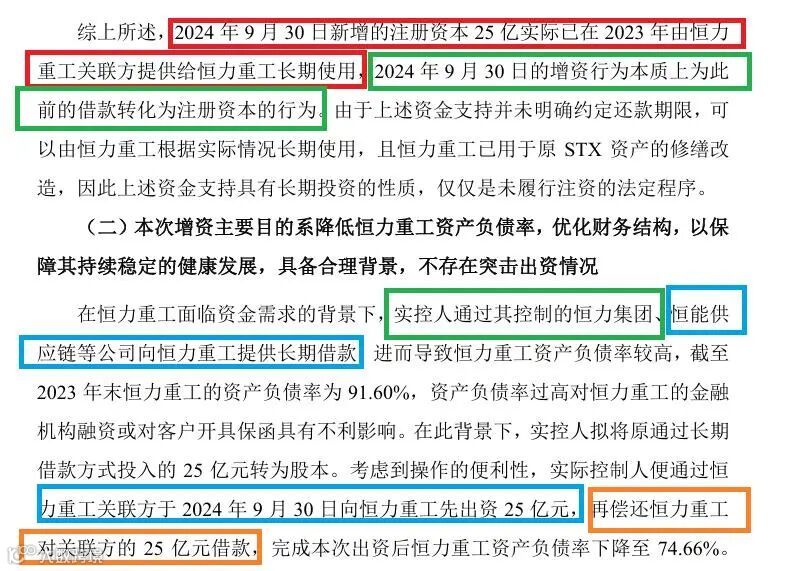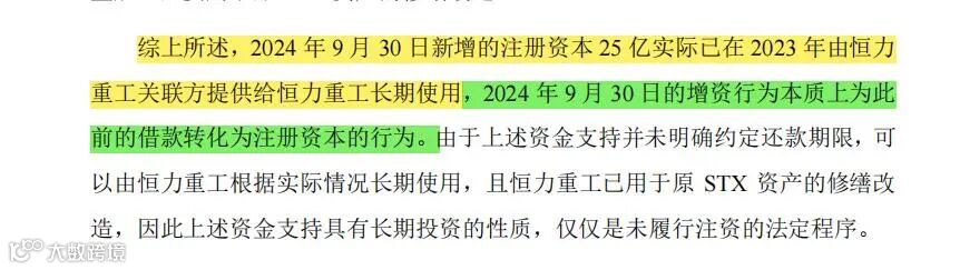 在公告中,*ST松发及西南证券等中介机构称:“2024年9月30日新增的注册资本25亿实际已在2023年由恒力重工关联方提供给恒力重工长期使用,2024年9月30日的增资行为本质上为此前的借款转化为注册资本的行为”;“上述资金支持具有长期投资的性质,25亿元借款由标的公司长期使用,具有“名债实股”的性质,仅仅是未履行注资的法定程序”。
