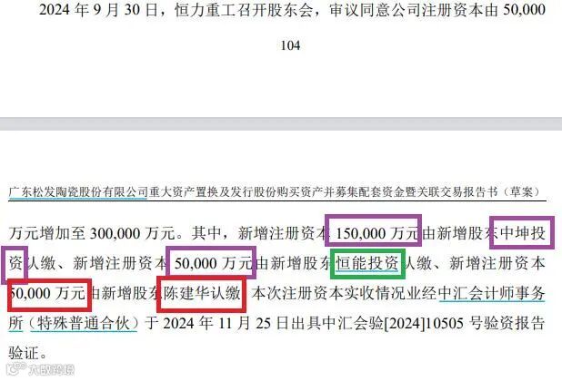 在重组草案中,*ST松发披露恒力重工2024年9月30日新增的25亿元注册资本,分别由中坤投资认缴15亿元、恒能投资认缴5亿元、陈建华认缴5亿元。