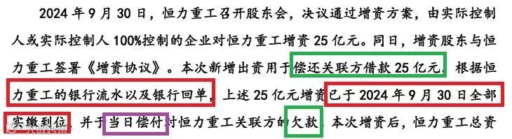 然而有意思的是,“上述25亿元增资已于2024年9月30日全部实缴到位,并于当日偿付对恒力重工关联方的欠款”。换言之,25亿元增资当天就流出至恒力重工关联方账户。*ST松发及中介机构给出的理由是偿还关联方借款。