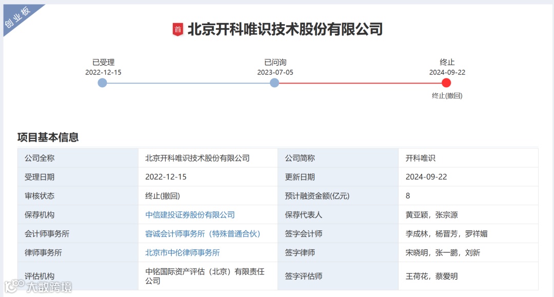 高速成长的开科唯识,也产生了闯关资本市场的计划。2022年12月15日,开科唯识创业板IPO申请获受理,中信建投保荐,计划募资8亿元。2023年7月之后,开科唯识完成两轮问询,但之后却迟迟未能上会,最终于2024年9月撤回IPO申请。