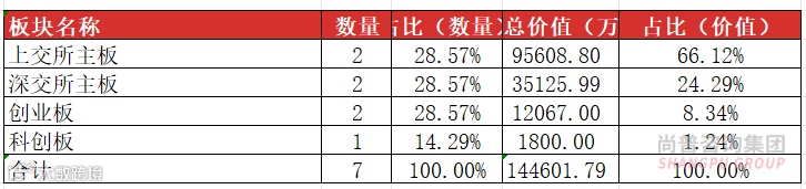 据统计,上周A股上市公司并购重组涉及交易金额共计约144,601.79万元,从上市板块来看,上交所主板交易金额约95,608.80万元、深交所主板交易金额约35,125.99万元,创业板约12,067.00万元,科创板为1,800.00万元。