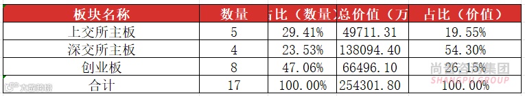 根据尚普咨询统计,本周(4.21-4.26)A股上市公司共发生17笔并购重组交易。从上市板块来看,上交所主板发生5笔、深交所主板发生4笔,创业板8笔。