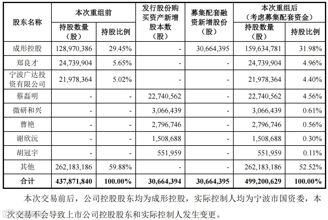 2022年9月8日,宁波精达实际控制人郑良才和郑功与宁波通商集团有限公司(下称“通商集团”)签订了股权转让协议,合计转让所持公司控股股东宁波成形控股有限公司(下称“成形控股”)100%股权,转让价格为10.85亿元。股份转让实施完成后,