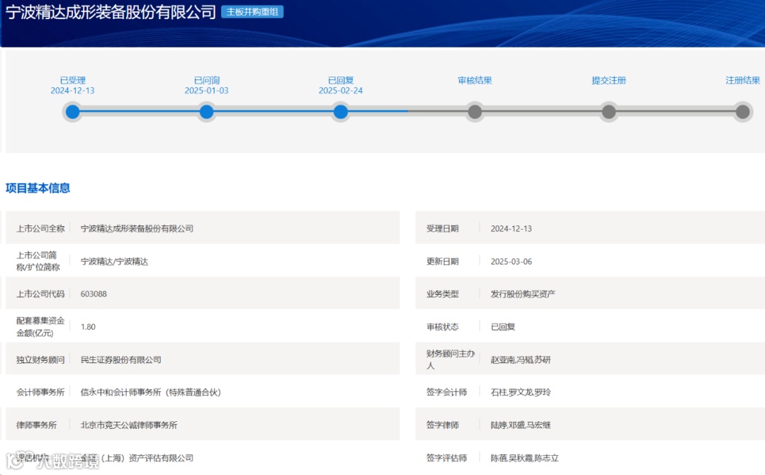 2025年3月13日,上交所并购重组审核委员会召开2025年第4次并购重组审核委员会审议会议,宁波精达(603088)发行股份购买资产申请获通过。
