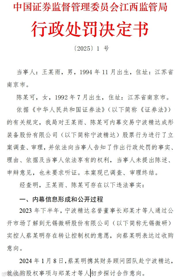 2025年1月23日,江西证监局公布了一份行政处罚决定书,里面对宁波精达并购无锡微研过程中的一起内幕交易案情进行了详细披露。