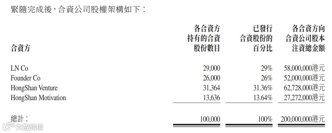 根据公告,合资公司的股本总额为2亿港元,其中LN Co、Founder Co、HongShan Venture及 HongShan Motivation将分别以现金注资5800万港元、5200万港元、6272.8万港元及2727.2万港元,并分别占合资公司股本总额之29%、26%、31.36%及13.64%。