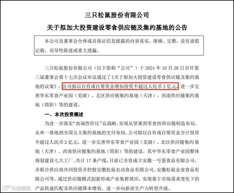 在另一份公告中,三只松鼠透露了《关于拟加大投资建设零食供应链及集约基地的议案》的细节。根据该议案,公司拟合计投资不超过人民币2亿元,进一步完善华东零食产业园(芜湖)、北区供应链集约基地(天津)、西南供应链集约基地(简阳)等的建设。