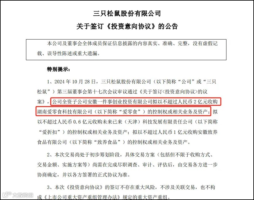 10月28日,三只松鼠发布公告称,将战略投资爱零食、爱折扣,入局量贩零食。