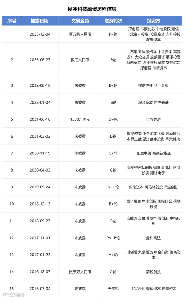 其二是在2023年6月,易冲科技获得由上汽集团战略直投基金、尚颀资本联合领投的数亿元F轮融资。这一轮融资意味着易冲科技在新能源汽车市场打开了局面。