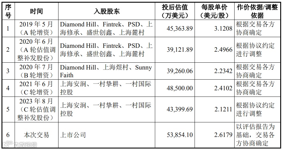 据回复,标的公司历史上共进行了三次融资及两次融资价格调整,历次增资对应估值情况如下: