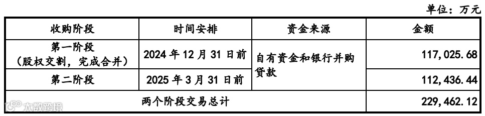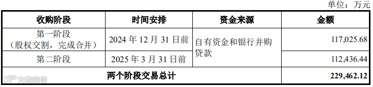 本次交易合计作价为323,975,485美元(按评估基准日中国外汇交易中心授权公布美元对人民币汇率中间价7.0827计算折合人民币 229,462.12万元),分两阶段付款,第一笔付款51%,于2024年12月31日前支付;第二笔付款49%,于2025年3月31日前支付。根据上市公司资金安排及与银行洽谈情况,收购资金来源为上市公司自有资金和自筹资金,其中自有资金支付金额为 91,784.85万元,支付比例约为40%;自筹资金来源为银行并购贷款,金额为137,677.27万元,支付比例约为60%。具体支付安排情况如下: