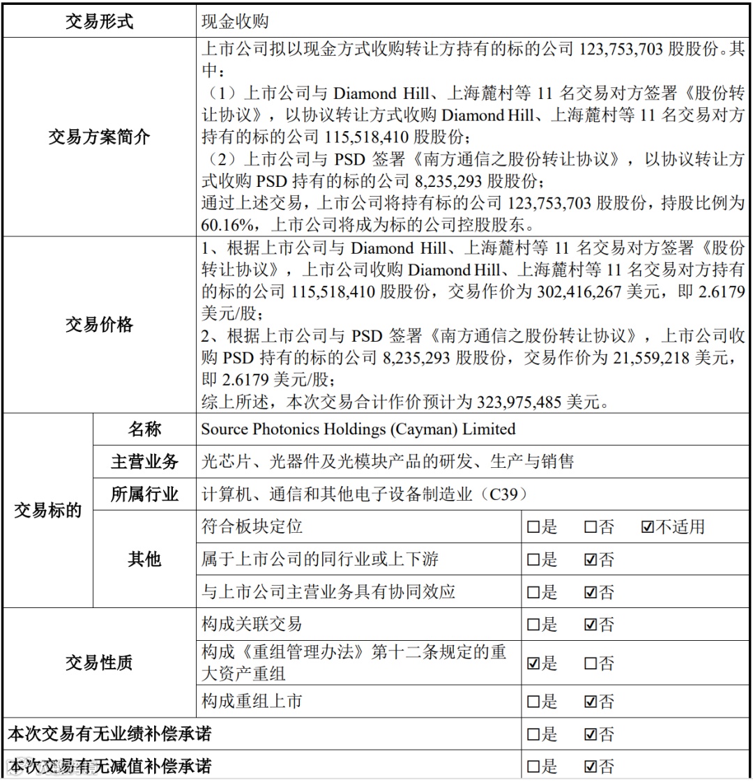 值得注意的是,万通发展业务主要包括经营性物业资产管理、房地产开发与销售以及通信与数字科技三大板块;标的公司所处的光通信模块及光芯片业务属于光通信设备行业,与上市公司主营业务不具有协同效应。重组方案概况如下: