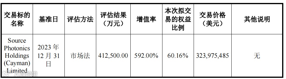 在评估基准日持续经营假设前提下,经市场法评估,索尔思光电股东全部权益价值为 412,500.00万元(按基准日中国外汇交易中心授权公布美元对人民币汇率中间价7.0827计算折合58,240.50万美元),较归属于母公司所有者权益59,610.08万元,评估增值352,889.92万元,增值率592.00%。